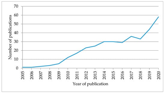 The sample obtained in the search carried out in WoS on Open Innovation and university has reported a total of 349 articles. In this same database (WoS) and in the same period, the number of articles generally related to Open Innovation was 3300. The number of publications per year has not been homogeneous, describing a rising line from 2005 to 2020 (Figure 2). Considering that the concept of Open Innovation was coined by Chesbrough in 2003 [], it is logical that production starts to emerge from the beginning of the 21st century.