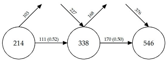 For the analysis of the evolution of keywords in the area, we use the methodology of Price and Gürsey [] (Figure 3). In order to better understand this method, the circles represent the periods that have been established; in the case of this research, there are three. Inside each circle is the number of keywords for that period. The arrows that join the circles represent the keywords that are maintained from one period to another and, in brackets, the stability index or overlapping fraction is indicated. On the other hand, the arrows that enter and leave each circle symbolise the new keywords and those that are no longer used in the next period, respectively.