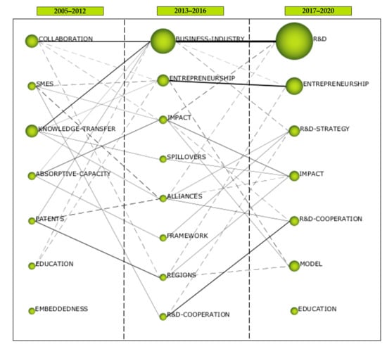 From the perspective of the evolution of the themes, the analysis of the sample allows us to see, in a first approximation, that there is no cluster that is maintained in the three periods with the same theme, although it is true that themes from the first or second period return to lead their clusters in the third period, such as entrepreneurship, impact, R&D-cooperation and education.