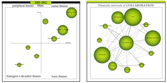 In the case of the 2005–2012 period, four driving themes were identified (Figure 5): collaboration, knowledge-transfer, absorptive-capacity and SMEs. Then, in the lower left quadrant appear education, patents and embeddedness, themes considered emerging or decadent, due to a low centrality and density. The main driving theme is collaboration, which has the highest degree of centrality and density. Its thematic network, from the point of view of the number of documents in which they appear, consists mainly of R&D (22 doc), networks (20 doc), business-industry (19 doc) and performance (14 doc), however, in terms of the density of relations between network members, the following dyads stand out: (a) collaboration with R&D, model, business–industry and networks, (b) challenges with commercialisation, (c) competence with model and commercialisation, (d) economy with networks, (e) model with R&D and, finally, (f) R&D with business–industry (Table 5).