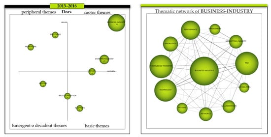 Evolution of the themes period 2013–2016 and thematic network of the cluster BUSINESS–INDUSTRY. Source: Prepared by the authors on the basis of SciMAT data.