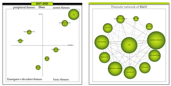 Evolution of the themes period 2017–2020 and thematic network of the cluster R&D. Source: Prepared by the authors on the basis of SciMAT data.