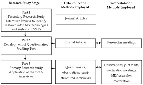 A triangulated research approach was adopted for this study. Part 1 consisted of a literature review which identified the key research around SMS technologies and systems in SMEs (previously described). Part 2 analysed the information obtained from the literature review to create a questionnaire. Part 3 involved the use of the questionnaire to survey 36 SMEs from which an SME profile was created with interviews being conducted to further contextualize the findings of the study. Figure 1 shows research method and survey design process adopted in this study.