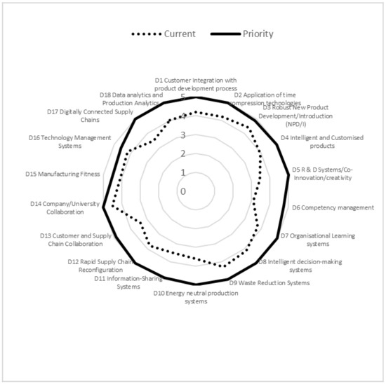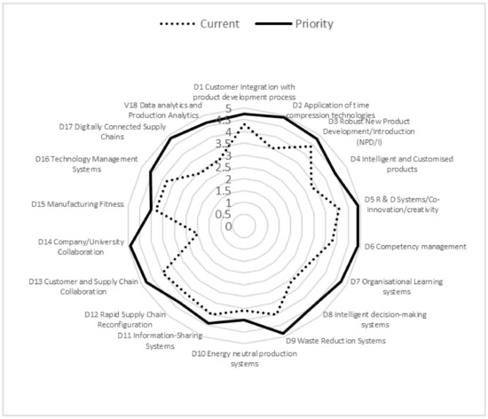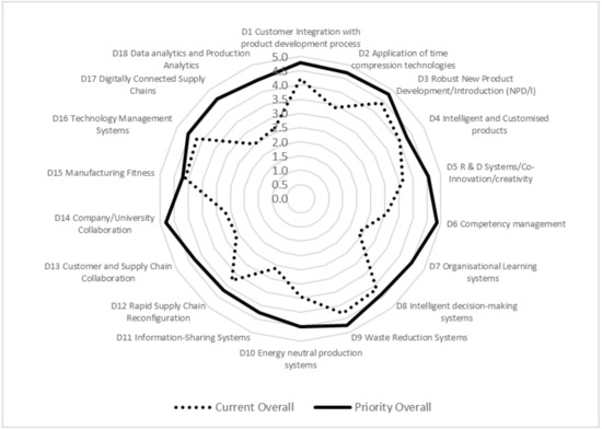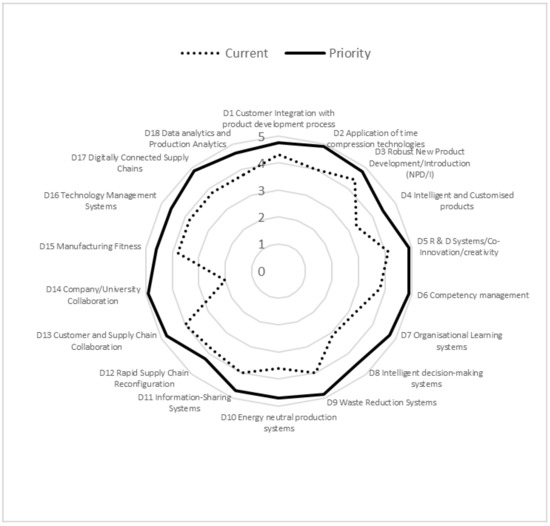 Food production SMEs were very different in structure and their technological capabilities were dependent upon the size of the organizations. Micro-SMEs generally tended to be artisan companies producing specialist food products using relatively standard technologies and systems. Figure 5 and Figure 6 show the results of the auditing work undertaken with these SMEs. The strategic priorities identified amongst micro-SMEs were the need for more effective Organizational Learning systems and more focus on time compression technologies as a means of delivering new products to market quicker. However, the standard time compression technologies around 3D printing etc. were not considered appropriate. Rather, companies required greater connectivity to customers and a more rapid process of taking new products to market through effective NPD/I processes was key. The use of social media systems to drive e-WOM and developing collaborative networks to reduce logistics costs were seen as key. Other areas primarily around dimensions D13 to D18 were not considered appropriate or required by micro-SME food companies as they felt that they were unable to exploit such systems due to their size and relatively basic technological capabilities.