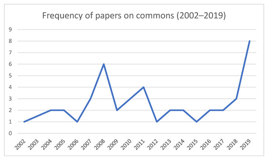 The discussion on commons is cited in the KM journals starting from the year 2002. This suggests that the introduction of the concept of commons in the KM literature has most likely started from the study by Carrillo [36]. This paper explores ways in which KM can enrich and be enriched by practices associated with social-level knowledge-based development. Although the paper used the term “global commons” only once, the principles of commons are argued within the context of global development [36]. Figure 2 presents the frequency count of papers on commons and shows the trend that illustrates two peaks observed in the year 2008 and 2019.