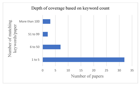 The researchers used the NVivo software [37] for thematic coding and analysis. Using NVivo during the analysis of qualitative data helped the researchers to manage and organize data, manage ideas, query data, visualize, and report from the data [37]. One of the ways to quantify the coverage is to count the number of keyword instances in the paper since keyword density is one of the key parameters of a knowledge resource that may influence positive learning outcomes [38]. Figure 3 highlights that 32 out of 44 (72%) of the papers reviewed include the term commons for less than five times, demonstrating a weak discussion of the commons in the KM literature.