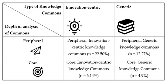 To comprehend the KM literature on commons at a holistic level, a two-dimensional mapping is proposed. In the first dimension (horizontal axis in Figure 4), the papers that have discussed innovation (“innovation-centric knowledge”), are differentiated from the papers that discussed knowledge without an explicit focus on innovation (“generic knowledge”). Typically, the “generic” category had a low number of instances of the keyword “innovation”. This classification is important because not all types of knowledge are relevant to innovation.