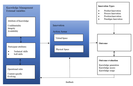 Although other studies have applied the IAD framework to analyze knowledge commons [15,20,93], they have not specifically extended IAD to innovation-centric knowledge commons. By applying IAD to innovation-centric knowledge commons, the conceptual model provides clarity to conceptualize innovation knowledge. The conceptual model addresses the people, technology, and process aspects of the organizational system design. Figure 5 demonstrates linking the innovation outcomes with the KM external attributes using the innovation action arena gives guidance to researchers and practitioners to execute the IAD framework that promotes innovation-centric knowledge commons.