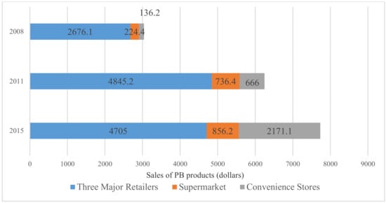 Sales of private brand (PB) products from three major retailers, supermarkets, and convenience stores (USD). Source: Chosun (2017) [32].