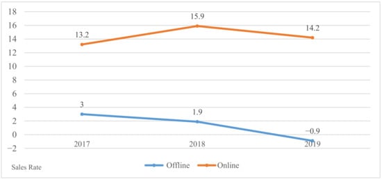 Figure 4 below shows rates of sales increase/decrease for major retailers relative to the previous year for 2017–2019. While online sellers continuously grew, offline retail growth fell to −0.9% in 2019. On this issue, the Ministry of Trade, Industry and Energy reported, “Although sales at convenience stores increased, sales at large discount malls and SSMs decreased due to the spread of online shopping, leaving offline sales decreased overall” [40].