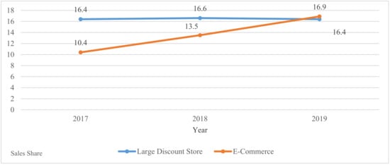Table 2 shows the sales share of large retailers, traditional markets, and online sellers. In 2006, the retail sales of traditional markets (27.2%) and large retailers (24.0%) were similar. However, in 2012, large retailers (25.7%) were far ahead of traditional markets (11.5%) due to their explosive expansion. Introduced around this time were the revised DIDA and APCLS. With regulations stopping the growth of conglomerate retailers, in 2017, the gap between the number of large retailers (15.7%) and traditional markets (10.5%) narrowed. However, portions of both of their market shares were taken by the new e-commerce market. During this period, sales in the e-commerce industry increased significantly to 28.5% [57].