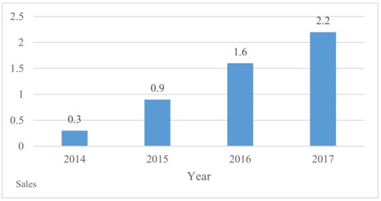 While large retailers experienced difficulty with the regulations and growth of e-commerce, the sales of Coupang, the leading online seller, were climbing faster than ever. Figure 6 shows Coupang’s sales by year. Few had expected the company to reach as much as USD $2.2 billion in 2017, as it had only achieved USD $0.3 billion in 2014 [58,59].