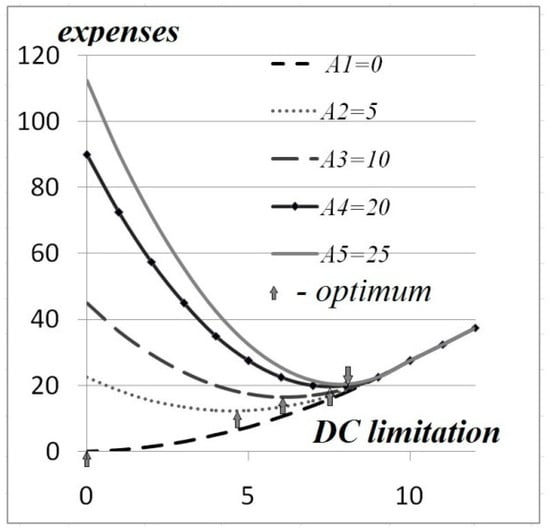 The values of the optimal volumes of emergent reserves that determine the size of DC storage are marked on the graph (Figure 3). Shown here is a set of calculation results carried out for various conditions of the influence of market uncertainty on the total expenses associated with maintaining the required level of reserves at the distribution center. On the graphs, DC parameters are marked that correspond to the minimum probable costs, which allows the use of calculation algorithms for the design and construction of logistics network nodes. As expected, the degenerate case of no costs for overdue or missing goods at the time of fulfillment of obligations is reflected in zero inventories. In all other cases, the minimum is achieved if a balance is maintained between the volume of work or the cost of maintenance and the likely losses due to partial dissatisfaction with shipment requests. In addition, the results also clearly show that as the relative share of penalty costs increases, the volume of emergent stock increases (Table 2).