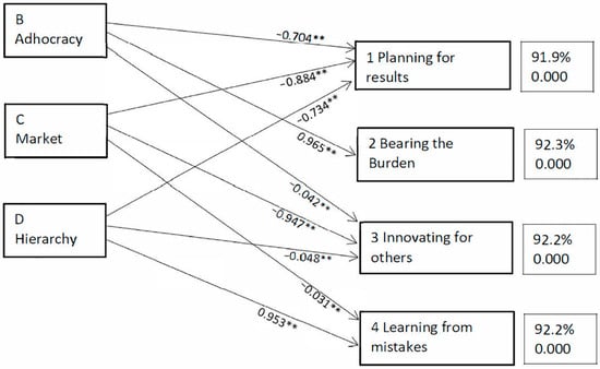 The significant connections are shown in the figure, denoted with arrows from the culture type to each of the four components. To the right of each of the components are the R-squares (determinant coefficients) shown as a percentage and in each case are high. To the right of the R-squares is the F-test’s p, which is lower than 0.05 (0.000) for all four components.