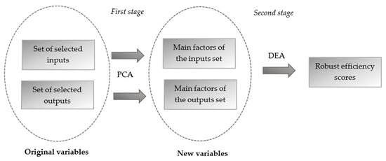 In order to obtain a more realistic result, and based on Guede et al. [58], we proposed a new model to solve the problem regarding the number of variables. With the PCA-DEA model, we applied principal component analysis (PCA) over the set of inputs and, separately, over the set of outputs. As a result, it was possible to reduce the number of inputs and outputs to apply DEA, thus increasing its discriminating ability. The PCA-DEA model is shown in Figure 1.