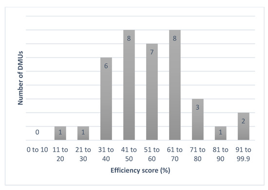 For the nonefficient DMUs, Figure 2 shows the number of DMUs by their efficiency score interval.