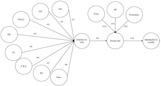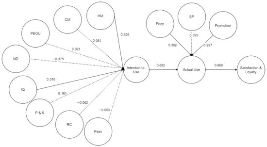 Based on Figure 1, there were 11 exogenous latent variables, which consist of hedonic motivation (HM), convenience motivation (CM), perceived ease of use (PEOU), navigational design (ND), information quality (IQ), privacy and safety (P and S), restaurant credibility (RC), perceived severity (PSEV), price, safe packaging (SP), and promotion. In addition, Figure 1 shows that there were three endogenous latent variables, which consist of intention to use, actual use, and satisfaction and loyalty.