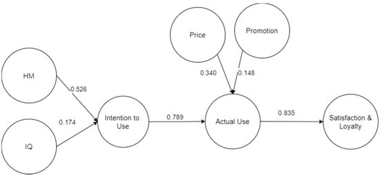 Price was found to have a significant direct effect on actual use (β = 0.34, p = 0.001). As discussed earlier, one of several pieces of information, important for customers in making a purchase, is price. Price, which includes food, tax, and delivery price, can determine customer willingness to pay and their perceptions toward OFDS. Customer perceptions toward OFDS can be measured by how much money they can save by using it. The more money a customer saves, or the lower the price that the customers pays, the more the customer tends to perceive that a related service is convenient to use [9]. Interestingly, SEM revealed that price has the second-largest effect after HM on the model framework. It is plausible, since HM is the main factor that encourages customers to use OFDS. In contrast, although customers have intentions to use OFDS, if the price is too high, they will cancel the order using OFDS. In addition, promotion as a complement to price is useful to make customers keep using OFDS.