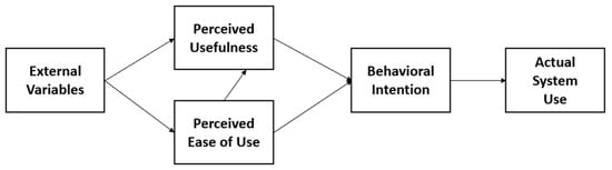 Many theories have been documented to account for people’s attitudes and behaviors. The most well-known theoretical framework is the theory of reasoned action (TRA), which was proposed by Fishbein and Ajzen in 1975 [23]. This model has been used widely, for example, in social, technological, and health fields. The TRA focuses on changes in users’ behavior, which is affected by their attitudes and subjective norms [11]. To remove the research model premise, Ajzen [24] proposed the TRA and added the perceived control factor into the model, and indicated the perceived control may impact people’s behavior. Studies of e-commerce and information technology have been conducted to better understand users’ acceptance [25]. Many theoretical models have been employed to analyze individuals’ adoption behavior. However, the TAM has become an important underpinning model that has been applied in various fields [26]. Two main variables, namely, perceived usefulness and perceived ease of use, were added to the TAM model, and the two constructs are impacted by external variables [27]. The external variables affect users’ behavioral intentions through perceived ease of use and perceived usefulness, which in turn influence users’ behavior. The technology acceptance model was shown in Figure 1.