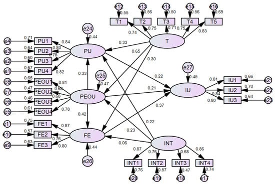 The structural equation model is shown in Figure 3. Structural equation modeling (SEM) is a statistical method used to analyze the relationship among factors based on the covariance matrix of variables, and the approach may increase the measurement precision of the study [62]. The model includes six latent variables, and the squared multiple correlation of PU, PEOU, FE, and IU are illustrated in Figure 3. In brief, the external variables show a positive indirect impact on perceived usefulness and perceived ease of use. Telepresence shows a strong impact on perceived ease of use. Then, perceived usefulness and perceived ease of use play a mediating role in the prediction of the behavior intention to use. Finally, the flow experience has the most powerful effect on intention to use.