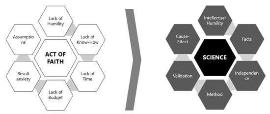 Management based on “acts of faith” is characterized as a set of behaviors or excuses, inappropriate for decision making in particular in the context of problem solving and manager behavior in general. In turn, management based on science principles [20], in particular with regard to decision making, is characterized by a different set of behaviors, both illustrated by Figure 3.