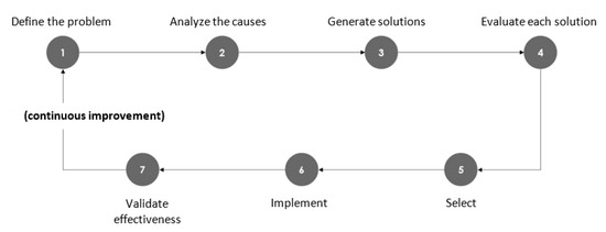 Problem-solving theory incorporates a set of steps towards identifying solutions to specific problems and achieving organizational objectives, along the so-called problem-solving cycle [11]. This cycle starts with the recognition of the problem and the analysis of its causes and ends with the monitoring and acquisition of knowledge for future situations and the strategy to solve it. In practice, being a cycle, it cannot be said that it ends in the assessment phase, which should be understood as the beginning of a new problem-solving cycle [11].