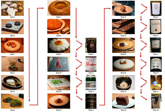 The subjects were exposed to common elements (stimuli) with 18 dishes and 10 wines organized in 11 starters or snacks, with three wines, four main courses; with four wines, and three desserts; and with three wines (Figure 1 and Table 1) for all diners (volunteers). Subjects were instructed not to eat or drink while the dishes or wines were presented to them, before proceeding to divide presentation and tasting of each stimulus to identify which generated the most interest [82].