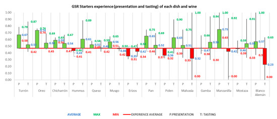 Figure 7 shows the level of arousal divided into three groups, corresponding to the chef’s proposal of Starters, Main Courses, and Desserts. The average galvanic skin response data of each dish and each wine, for the presentation phase and tasting phase, are included together with the dish average and wine average. According to the menu designed by the chef and the sommelier, the level of arousal (compared by groups of dishes and wines) of the experience showed that differences between these moments were significant, with the Starters the better rated (with an average GSR of 0.53 for dishes, 0.47 for wines and 0.51 for the starters group experience), followed by Desserts (0.41, 0.46 and 0.43, respectively) and Main Courses (0.38, 0.44 and 0.41, respectively). In group 1 (Starters), the GSR average for wines was lower than the GSR average for dishes, but during groups 2 (Main Courses) and 3 (Desserts), the wine GSR average was higher than the dish average. Group 1’s GSR average experience was 21.43% higher than the GSR average experience of groups 2 and 3. The midway point of the experience was between the Gamba and Mostaza dishes, so Main Courses and Desserts were in the second part of the experience. In this second part was when the wines’ GSR average was higher than the dish GSR average. Fatigue on the part of the consumers is a possible partial conclusion and occurs after the midway point (moment from which the main dishes and desserts arrive) of the experience.