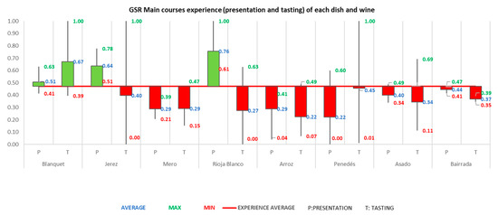 In this group (Main Courses), most of the dishes had GSR values (presentation and tasting) below the experience average. Only the Blanquet dish had values over the experience average, and moreover, tasting was higher than presentation. For the main courses, the arousal of the presentation and tasting was lower than the experience average. This was due to the experience length, as most of the dishes were served after the mid-point of the experience, and consumer attention decreased.