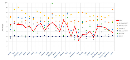 Figure 9 shows the GSR average percentage of each dish and wine, and every interpretation value obtained for the brain activity using EEG technology (Table 3).