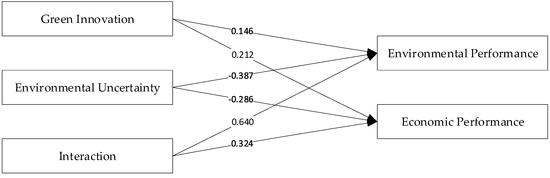 The model analysis results revealed that green innovation positively affects environmental and economic performance. When the standardized coefficient estimation values were examined, green innovation’s effect on environmental performance was stronger than that on economic performance—the results of the analysis support the H1a and H1b hypotheses. Following the analysis of the structural equation model, a moderator impact analysis was conducted. Before conducting the moderator impact analysis, an interaction variable was created by multiplying the independent variable, i.e., green innovation, and the moderator variable, i.e., environmental uncertainty. Then, a path analysis was conducted using the Amos package program. The analyzed model’s (Figure 3) results are shown in Table 7.