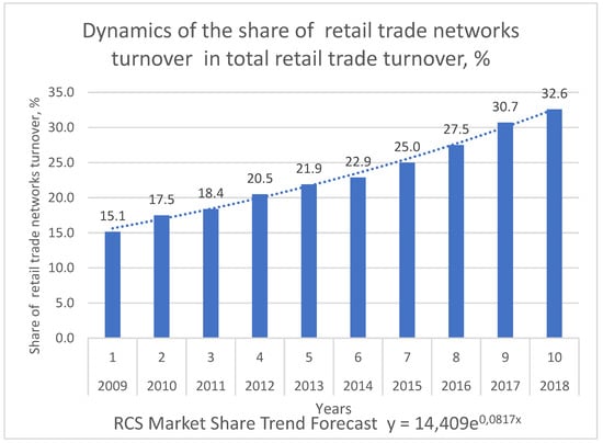 The dynamics of the share of retail trade networks turnover (Figure 2) show that modern RCS are characterized by the following: