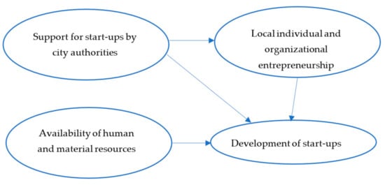 Therefore, cities that are the setting for this reflection and research should be interested in the emergence and development of start-ups, as they are not only a source of support for local entrepreneurship, but also contribute to strengthening open innovation that fosters intensive economic and social growth [37,38,39]. They can also play a coordinating role in the process of knowledge transfer and diffusion between urban stakeholders.