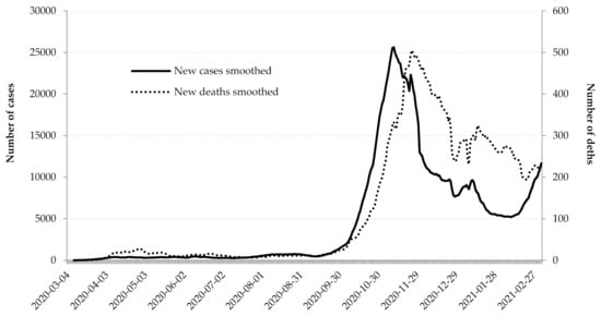 - Ritchie, H.; Ortiz-Ospina, E.; Beltekian, D.; Mathieu, E.; Hasell, J.; Macdonald, B.; Giattino, C.; Roser, M. Statistics and Research-Coronavirus Pandemic (COVID-19). Our Word in Data. Available online: https://ourworldindata.org/coronavirus (accessed on 6 March 2021).