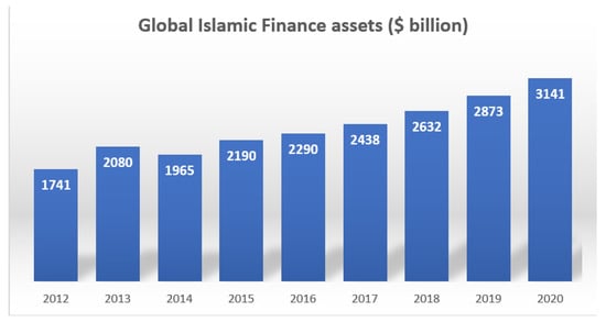One of the key features of Islamic finance is that it encourages asset backed financing, ensures financial and social stability, addresses financial inclusion, and supports the comprehensive and overall development of the society, which are important for sustainable development [5,50,51]. Islamic finance places great importance to the quality of life for all, social justice, and fair-trade relations [23]. Islamic finance prohibits the trade and financial transactions with excessive risk, speculation and uncertainly to safeguard the interest of everyone concerned [52,53]. To safeguard the interest of one and all, Islamic finance prohibits several practices such as ambiguity in contracts (gharar), gambling, and contracts with high degree of uncertainty and probability (maisir), fraud, and all types of interest (riba) based transactions [54,55,56]. The traders are not allowed to trade in the goods and services which are prohibited (haram) by Islam such as pork, unlawful illegal goods declared by the state, certain weapons, illegal drugs, pornography, etc. [57,58]. It can be argued that the Islamic financial system has survived the stern test of the global financial crisis and emerged as the winner and is there to stay [59,60]. It can be seen in Figure 1 below that even after the financial crisis, Islamic finance maintained its steady growth and its assets were growing rapidly. It is projected that the Islamic finance assets will reach to 3472 Billion by 2024 [61]. The COVID-19 pandemic has given another opportunity to the Islamic financial system to show its resilience with social financial services and prove its mettle again and emerge as the true contender to the conventional financial system [5,6,7]. It is argued that Islamic finance has an important role to play post COVID-19 as the open social innovation of the financial system [5].