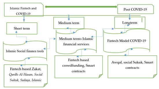 The COVID-19 pandemic is at its last stage, due to the news of the vaccine coming up and the broader economy shifting from ‘respond’ to ‘recovery’ mode. New opportunity arises for some Fintech companies to leverage their unique assets and skills to seize this opportunity. It also provides the prospect of the Islamic financial institutions (IFIs) grabbing this opportunity and providing a sustainable and enduring financial service with the use of technology called Fintech. Islamic financial services are based on the principles of value creation, risk sharing, ethics, and economic wellbeing for all. If combined with the Fintech it has the potential to emerge as the alternative financial system and challenge its conventional counterpart [7,82]. Based on 125 finalized studies, the proposed model “3-stage Islamic Fintech for post COVID-19” assumes to work in three stages, namely short run emergency support, medium run recovery, and long run recovery and resilience. The short run, medium run, and long run are defined as per the definitions given by [125]. The short run is identified as a period less than a year, medium run is defined as the period between one year to five years, and a period of more than five years is classified as long run. The proposed model is described in the section below.