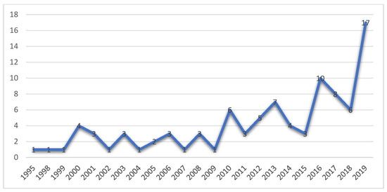 Figure 3 illustrates the overall increase in the number of articles published on the subject during the selected period. Figure 3 shows a trend of significant growth in publications since 2010, with the highest number of published articles in 2019, with 17. In 2019, the Journal of Technology Transfer published the special issue “Economic, Technological and Societal Impacts of Entrepreneurial Ecosystems” and the journal Technological Forecasting & Social Change published the special issue “Understanding Smart Cities: Innovation Ecosystems, Technological Advancements, and Societal Challenges.”