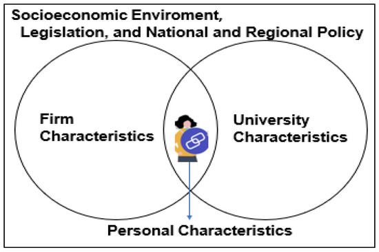 In the CIMO perspective, the contexts analyzed are the internal and external environments that influence behavioral change [14,16]. This systematic literature review identified both external and internal contexts: (1) the external contexts were the socioeconomic conditions and the national and regional laws and policies; (2) the internal contexts were the universities’ characteristics, the firms’ characteristics, and the researchers’ characteristics. A region’s capacity to absorb knowledge is most often associated with its socioeconomic conditions [19]. The ability of universities to invest in research and development (R&D to generate knowledge and apply it in industries generating innovations depends on political, economic, and social conditions [9].