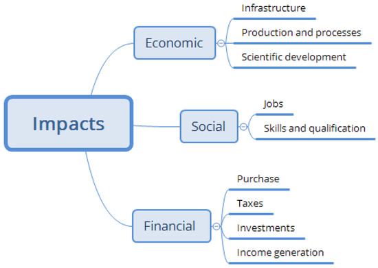 In this systematic literature review, the outcomes are the socioeconomic impacts of the university–industry collaborations. We classified the outcomes into three dimensions: (1) economic, (2) social, and (3) financial. We further subdivided each dimension as follows: (1) economic: infrastructure, production and processes, and scientific development; (2) social: jobs, skills, and qualification; and (3) financial: purchases, taxes, investments, and income generation. Figure 5 shows the proposed model for measuring the economic impact of university–industry collaborations.