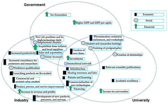 Entrepreneurial universities can contribute through an advisory role in public policy formulation [19,46,58]. In this role, universities engage with local communities on a variety of themes. Nevertheless, most of the services and activities supplied by institutions cannot be easily quantified [19]. A university–industry collaboration can have several socioeconomic impacts on the actors in [59] triple helix; therefore, we propose a conceptual model of socioeconomic impact based on the main benefits from the actors in the triple helix. Figure 6 illustrates our Socioeconomic Triple Helix Conceptual Model.