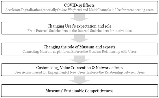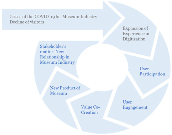 53]. Both concepts are well suited to the purpose of the museum as a space for social discourse. These changes in participation will determine the sustainability of the museum and are expected to accelerate, even after the COVID-19 pandemic. In light of these recent changes, user engagement in museum management and the resulting expansion of experience are expected to co-create value, and further achieve open innovation (see