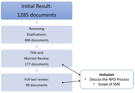 The initial search yielded 1285 documents. This vast collection of documents is filtered so that it aligned with the research questions. First the filter aimed to removing item duplications, reducing the portfolio to 606 documents. Discussions on SMEs are also linked with financial and organizational communication, supply chain, and production, which are not relevant with the focus on NPD. Based on the titles and abstract, a second filtering was conducted to select articles that focus on the NPD process, resulting in 177 documents. Next, using the same criteria that only articles focusing on the NPD process in SMEs will be further analyzed, we performed a full-text review. To ensure the scientific quality of the research, only articles published in journals with a double-blind review process were included. This is the most exhaustive filtering process, yielded 99 articles relevant to the NPD process pertaining to SMEs. The process is illustrated in Figure 1.