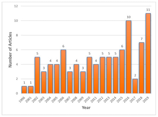 The database of articles consists of 99 papers, with the publication year from 1996 to 2019. The distribution of articles based on the year is shown in Table 1 and Figure 2.