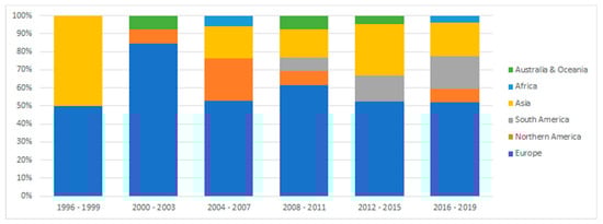Most of the studies concern Europe, although trends show that since 2004, various regions have been investigated. The volume of studies that concern Asia remains mostly consistent over time. The region of study is shown in Figure 3.