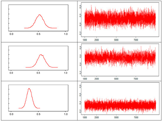 We summarize their results through traditional measures, including the posterior mean, 95% credible intervals, and a conclusion based on the strength of evidence about the latent associations. This is reported in Table 4 and in Figure 2. There is strong evidence of positive associations for all hypothesized relationships, with the majority of the posterior mass lying in positive territory in all cases. Full multivariate posterior distributions are obtained as part of the MCMC output, which shows good mixing as portrayed in Figure 3.
