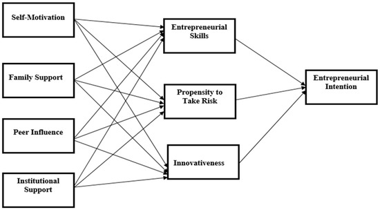 Second, the findings indicate that all the mediating variables (entrepreneurial skill, propensity to take a risks, and innovativeness) mediate the relationship between self-motivation, family support, peer influence, institutional support, and entrepreneurial intention. Previous studies reported that entrepreneurial skill is an important measure to determine the stability and success of entrepreneurial practices [8,41]. Yurtkoru and Seray [78] argued that the propensity to take risks increases individuals’ confidence, thus, influencing their ability to be involved in the decision-making process. It enhances their entrepreneurial intention and experiences, which transforms creative thinking and helps them to make high-risk decisions. In the current study, a propensity to take risks is mediated and significantly affects self-motivation, family support, peer influence, institutional support, and entrepreneurial intention.