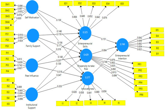 In Hypothesis 2–4, we proposed that there was an indirect relationship between entrepreneurial skills, the propensity to take risks, and innovativeness. For the PLS-SEM method, we calculated the bootstrapping in order to test the specific indirect effect. The results shown in Table 5 indicate that entrepreneurial skills were mediated by the relationship between self-motivation, family support, peer influence, institutional support, and entrepreneurial intention, with obtained values being (β = 0.020, 0.027, 0.048, 0.021), (t = 2.251, 2.733, 3.377, 2.315), and (p = 0.023, 0.006, 0.000, 0.021), respectively. The propensity to take risks also mediated the relationship between self-motivation, family support, peer influence, institutional support, and entrepreneurial intention, with observed values being (β = 0.012, 0.014, 0.018, 0.029), (t = 2.036, 1.973, 2.103, 2.745), and (p = 0.042, 0.043, 0.035, 0.006), respectively. Furthermore, innovativeness mediated the relationship between self-motivation, family support, peer influence, institutional support, and entrepreneurial intention, with the reported values being (β = 0.116, 0.111, 0.237, 0.151), (t = 3.153, 2.913, 5.535, 3.278), and (p = 0.001, 0.003, 0.000, 0.001), respectively. Through these results, all the constructs fully mediated and significantly and positively affected the relationships, and all the hypotheses were accepted.