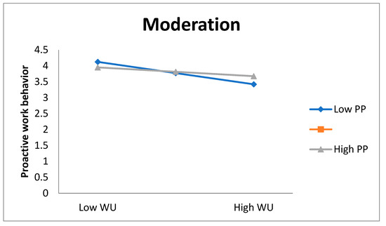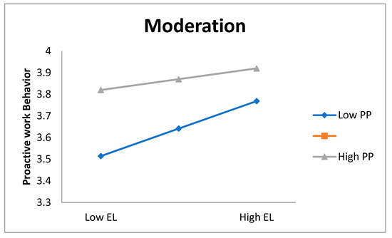 When entrepreneurial leadership and work uncertainty were entered together in the regression model, the value of entrepreneurial leadership reduced from 0.30 to −0.15 (comparing Model 1 and Model 3 of Table 3) but significantly highlighted that work uncertainty partially mediated the association of entrepreneurial leadership and proactive work behaviour. Further, the Sobel test was carried out to assess the mediation effect of work uncertainty and found it significant (p < 0.001). The achieved results empirically supported the H2 of the study. The third hypothesis of the research stated that proactive personality moderates the relationship between entrepreneurial leadership and proactive work behaviour. To gauge moderation and mediated moderation outcome [85], entrepreneurial leadership must be significantly associated with proactive work behaviour, which is already assessed as presented in Model 1 of Table 3. Secondly, the scholars tested whether the interaction among entrepreneurial leadership and the proposed moderator (i.e., proactive personality) is significantly associated with proactive work behaviour [85]. Outcomes linked to the interaction of entrepreneurial leadership and proactive personality on proactive work behaviour is presented in Table 4. The results exposed that proactive personality as a moderator interacted with entrepreneurial leadership to forecast employees’ proactive work behaviour. The less proactive personality employees are more inclined to show proactive work behaviour, as shown in Figure 2. The result is consistent with the previous research [73,86]. Therefore, Hypothesis 3 of the study was also supported by the data.