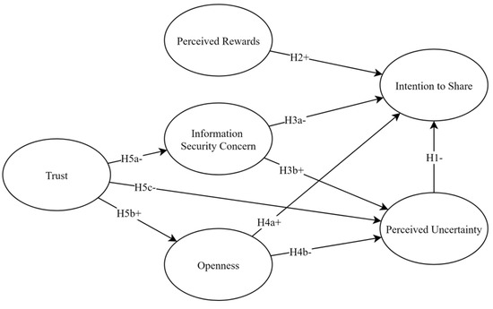 Moreover, people’s concern about information security will lead them to produce perceived uncertainty when sharing information resources. Because when people find it difficult to assess the information recipient’s capacity to safeguard their information, they cannot predict whether their information will be protected and whether they will be harmed due to information disclosures. It will cause them to perceive more uncertainty [15,33,43]. Thus, the following hypothesis is proposed: