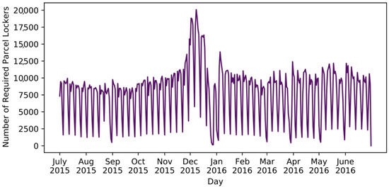 The number of deliveries per day was calculated based on delivery data from the delivery company Gnewt in Central London, UK [33]. The data set includes details (i.e., number of successfully delivered parcels, failed deliveries, successful pick-ups, attempted pickups, shift start, shift duration, delivery duration, and travel distance) of 13,358 delivery tours using electric vehicles from July 2015 to June 2016 inclusive. During this time, around 2 million parcels were delivered. The number of parcel lockers required per day is the sum of the number of deliveries on a specific day and the number of parcels picked up on the following day and the number of parcels not picked up by customers on the previous day.